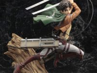 森の中での戦いをイメージした躍動感溢れるポーズで立体化!超硬質ブレードを振り上げ、今にも巨人に斬りかかろうとする一瞬を再現!エレンらしい意志の強さを感じさせる表情や、違和感なく表現されている両足が宙に浮いているポーズが見所となっています。