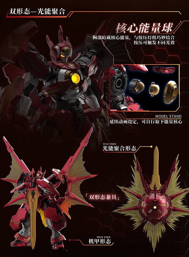 赤と金を基調とした、炎を思わせる鮮烈なカラーリングが目を引き、威風堂々たる巨大ロボットの姿は圧巻の一言。