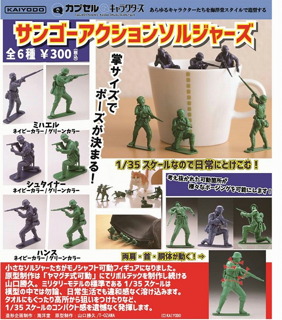 【ガチャガチャ】海洋堂「サンゴーアクションソルジャーズ」発売決定、山口勝久氏が原型のモノシャフト可動フィギュア 2018年03月11日 23:27 ガチャガチャ・プライズ海洋堂リボルテックカプセル|CM() モノシャフト可動フィギュア ■発売決定 カプセルQキャラクターズ サンゴーアクションソルジャーズ メーカー 海洋堂 2018年6月発売予定 1回300円 小さなソルジャーたちがモノシャフト可動フィギュアになりました。 原型制作は「ヤマグチ式可動」にてリボルテックを制作し続ける山口勝久氏。 ミリタリーモデルの標準である1/35スケールは模型の中では勿論、日常生活でも違和感なく溶け込みます。 全6種類 ・ミハエル(ネイビーカラー) ・ミハエル(グリーンカラー) ・シュタイナー(ネイビーカラー) ・シュタイナー(グリーンカラー) ・ハンス(ネイビーカラー) ・ハンス(グリーンカラー)