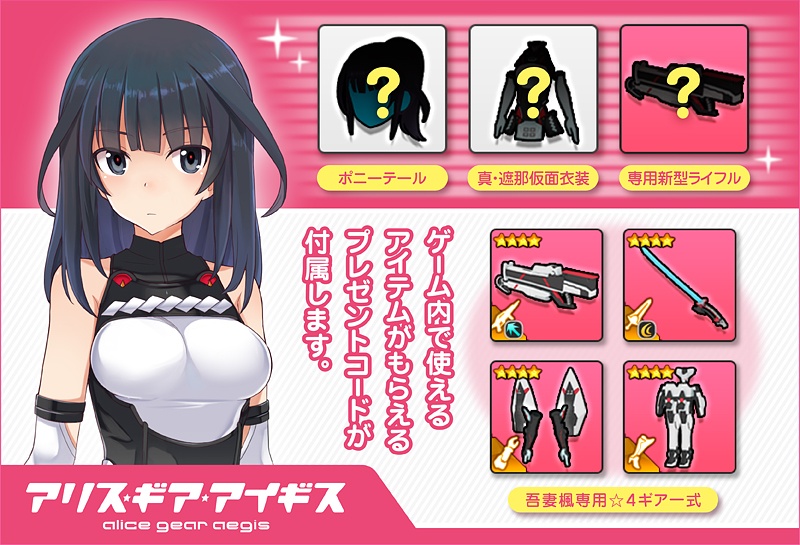 ・吾妻楓専用プレゼントコード『アクセサリ「ポニーテール」、コスチューム「真・遮那仮面衣装」、ショットウエポンギア「専用新型ライフル」、既存の吾妻 楓専用ギア一式』が付属します。