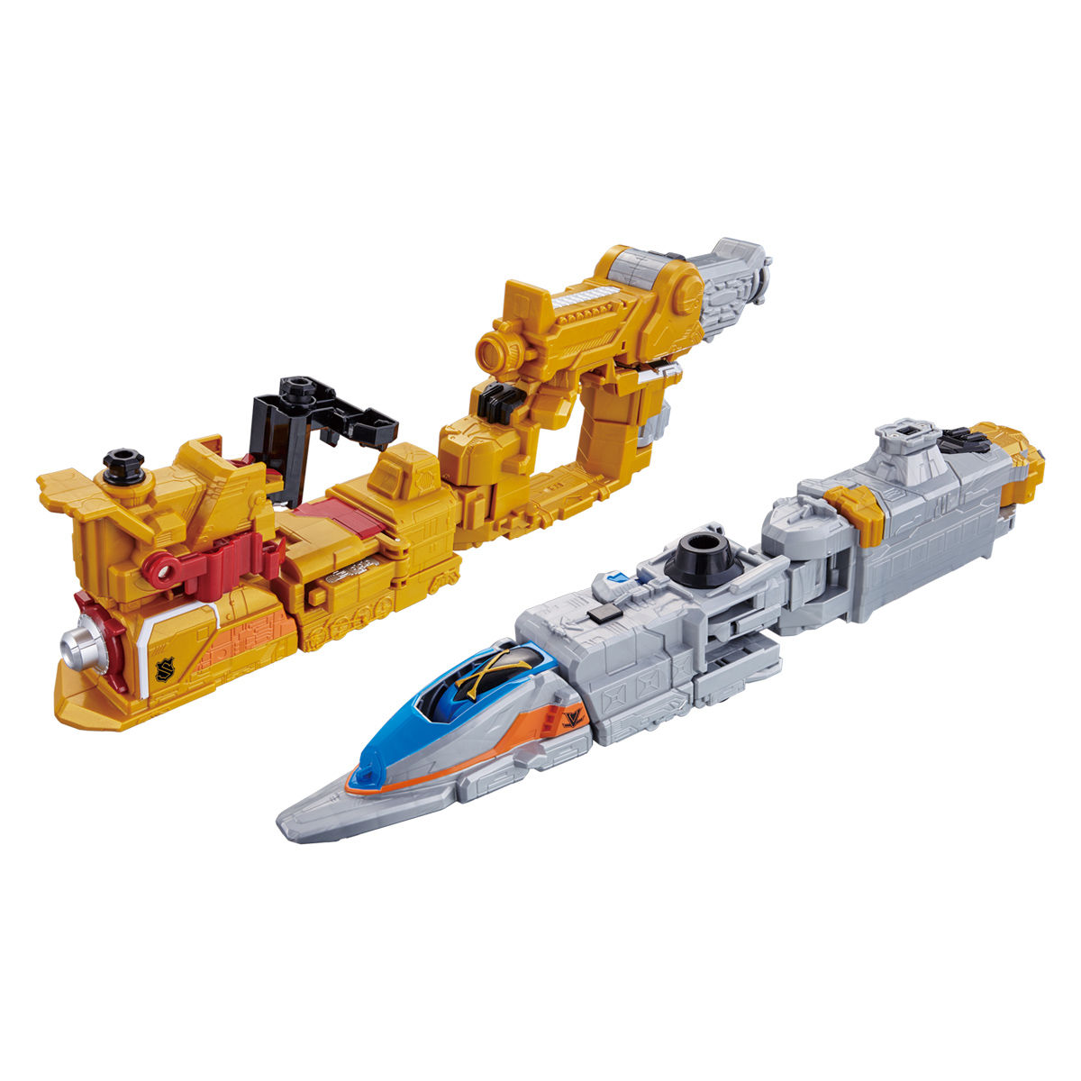 2両のエックストレイン、ゴールドとシルバーが2モード合体で銃になり、