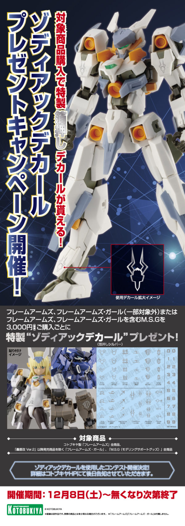 フレームアームズ、フレームアームズ・ガール(一部対象外) またはフレームアームズ、フレームアームズ・ガールを含むM. S.Gを3,000円(税抜)以上ご購入ごとに『特製“ゾディアックデカール”』をプレゼント!