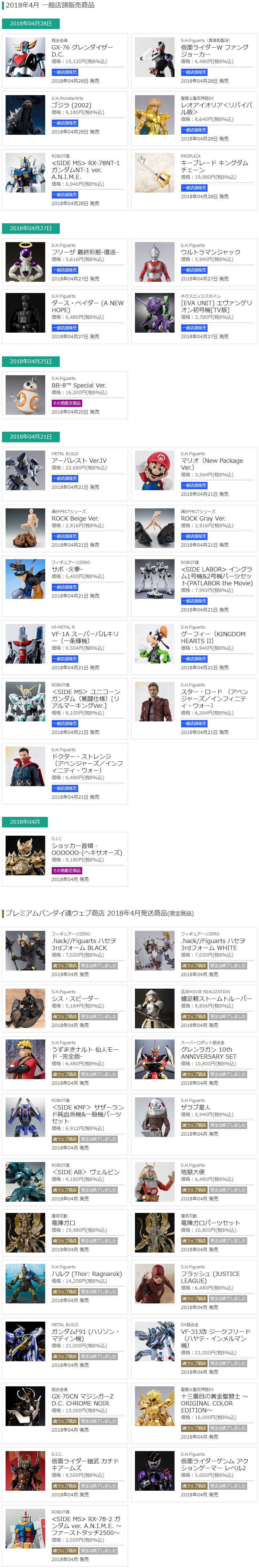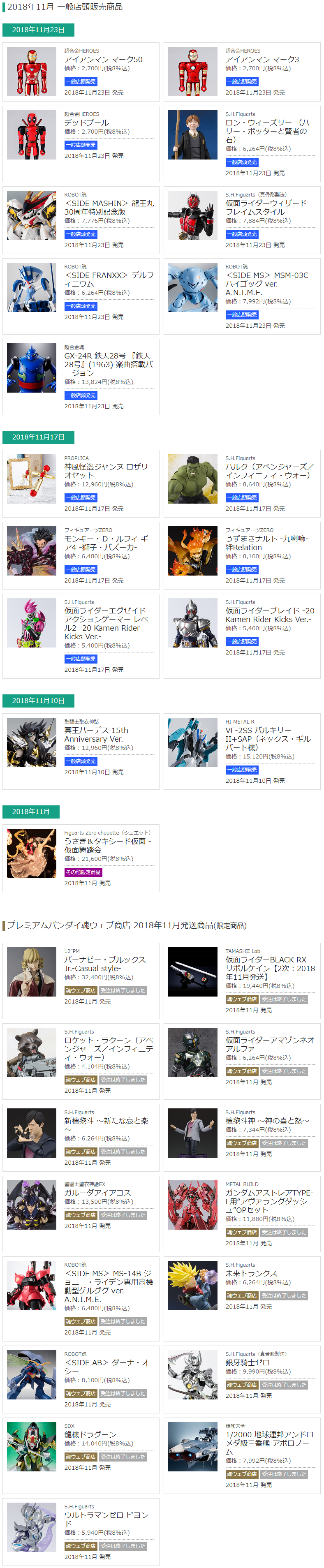 2018年発売「S.H.フィギュアーツ」「ROBOT魂」ほかバンダイコレクターズまとめ 2018年12月31日 15:51 ガンダム仮面ライダーロボ魂/フィギュアーツプレバンS.H.FiguartsROBOT魂発売月まとめ|CM() コレクターズ 2018年発売 ■バンダイコレクターズ201/年発売(再販、プレバン含む) S.H.Figuarts ROBOT魂 ほかまとめ 1月 tamashii.jp/item_schedule/ 2月 3月 4月 5月 6月 7月 8月 9月 10月 11月 12月 ■2017年記事 2017年発売「S.H.フィギュアーツ」「ROBOT魂」ほかバンダイコレクターズまとめ