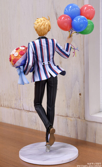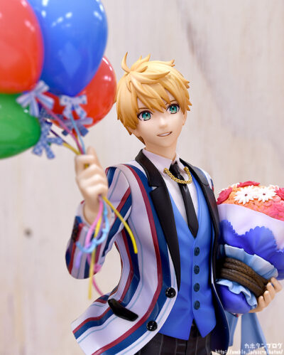 大人気スマホゲーム『Fate/Grand Order』より、「セイバー/アーサー・ペンドラゴン〔プロトタイプ〕」の二周年記念概念礼装「英霊正装」イラストをモチーフにしたスケールフィギュアが登場です。記念すべき日を喜ぶかのような晴れやかな表情と軽やかな佇まい。ストライプ柄のジャケットの気品ある質感や、豪華な花束、そして遊び心を感じさせるバルーンもイラストのイメージそのままに再現いたしました。是非、マスターのみなさまのお手元におむかえください。