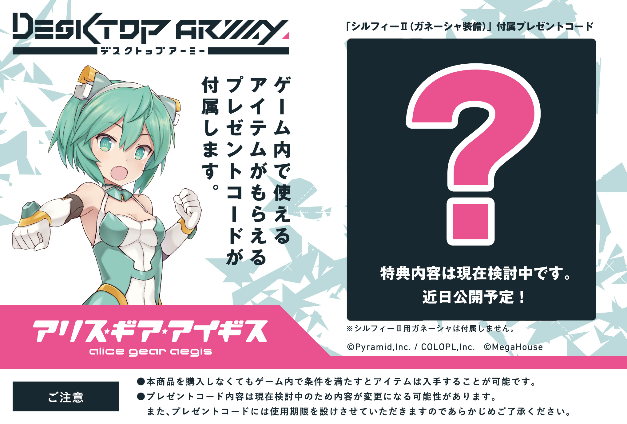 「アリス・ギア・アイギス」コラボ第2弾!シルフィーⅡが「ガネーシャ装備」になってゲーム連動企画として登場します。シルフィーⅡ素体には オプションパーツとして「泣き顔パーツ」と「素足パーツ」が付属します。また、大型ギア「ガネーシャ」はアーム展開ギミックを内蔵し シリーズ最大級のボリュームで再現しております。さらに、封入特典として ゲーム内で使えるアイテムがもらえるプレゼントコードが付属します 。勿論、シリーズ共通のハードポイント内蔵で従来のシリーズとの互換性もバッチリ。 武装の組み合わせは無限大!自分だけの小隊を創ってデスクトップを制圧しよう!