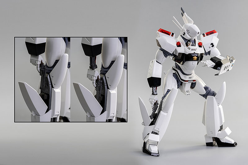 襟の両脇のパトランプカバーや、右ふくらはぎのサイドカバーが開閉でき、右ふくらはぎの中にはハンドリボルバーカノンを収納可能です。また右手首の伸縮ギミックにより、収納状態のハンドリボルバーカノンに手を伸ばすギミックが再現できます。