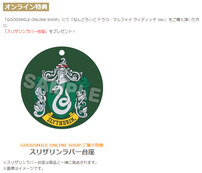 「GOODSMILE ONLINE SHOP」にて「ねんどろいど ドラコ・マルフォイ クィディッチ Ver.」をご購入頂いた方に、 「スリザリンラバー台座」をプレゼント!