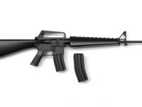 1960年代に米軍で採用された、小口径高速弾を使用するアサルトライフ ル、M16。木製部品を使わずに鉄、アルミ、プラスチックで構成された黒一色の外観から「ブラックライフル」の異名で呼ばれました。このA1型は、M16の実戦投入直後に発生した不具合を改善した陸軍・海兵隊採用モデルで、ボルト強制前進装置の追加や、鳥籠型ハイダーの装備が特徴です。