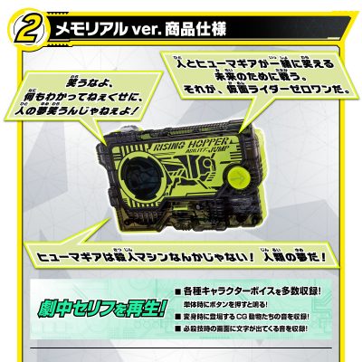 プログライズキーは、すべてメモリアルver.となっており、各種キャラクターボイスを多数収録しているだけでなく、劇中で変身時に登場するCG動物たちの音声や、必殺技時の画面に文字が出てくる際の音声を収録しています。