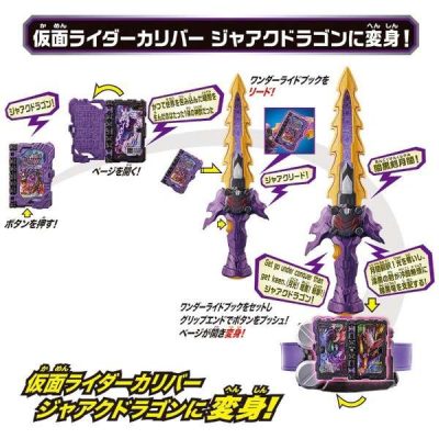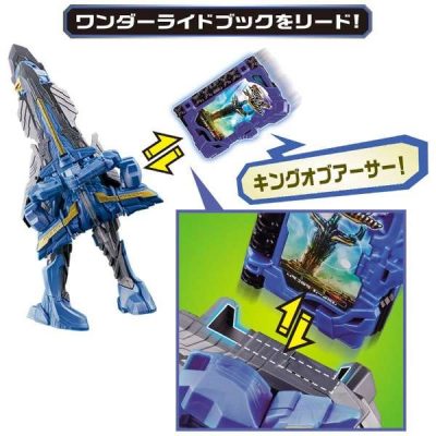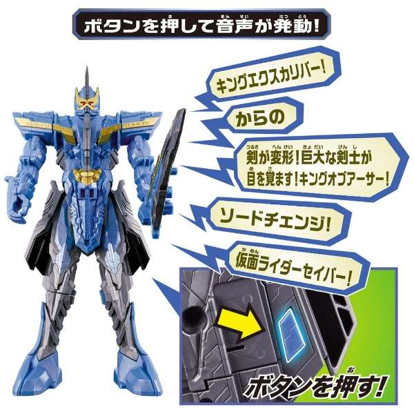 仮面ライダーセイバーより、『DXキングエクスカリバー&キングオブアーサーワンダーライドブック』が登場。仮面ライダーセイバーが使うパワーアップ武器が大型ロボへ変形!必殺技音声や変形音が楽しめる。ワンダーライドブックが付属し、別売りのDX聖剣ソードライバーと連動してパワーアップ変身遊びが可能。(使用電池)LR44 x 4 (付属)