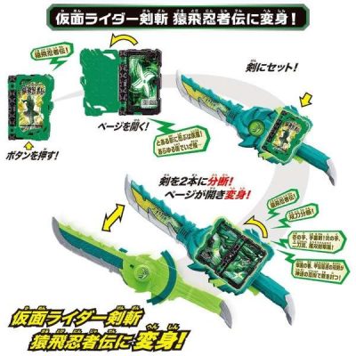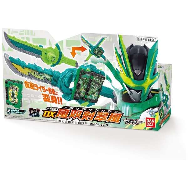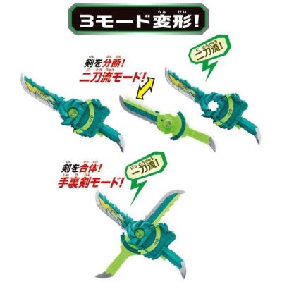 仮面ライダーセイバーより、『変身聖剣 DX風双剣翠風』が登場。10月登場仮面ライダーの変身聖剣。一刀流モード、二刀流モード、手裏剣モードの3種類にモード変形。ワンダーライドブックをセットして剣を分離することで変身音が発動。ワンダーライドブック付属。(使用電池)LR44 x 4 (付属)