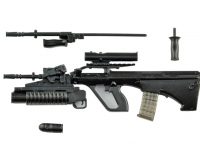 オーストリアで開発された自動小銃「AUG」。ストックに機関部を収め、銃身長とコンパクトさを両立するブルパップ方式の代表格です。A2型は、従来機で不満の多かったキャリングハンドル兼用固定式スコープを20mmレイルに変更した発展型です。AUG用アタッチメントを介して装備するM203グレネードランチャーも用意されました。類似の構成モデルをオーストラリア国防軍がF88S Austeyrの名称で採用し、実戦投入しています。