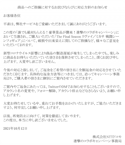 先日ご購入いただきました「The Final Season リヴァイ/ミカサ 戦闘シーンフィギュア」について対応方針のご案内を申し上げます。