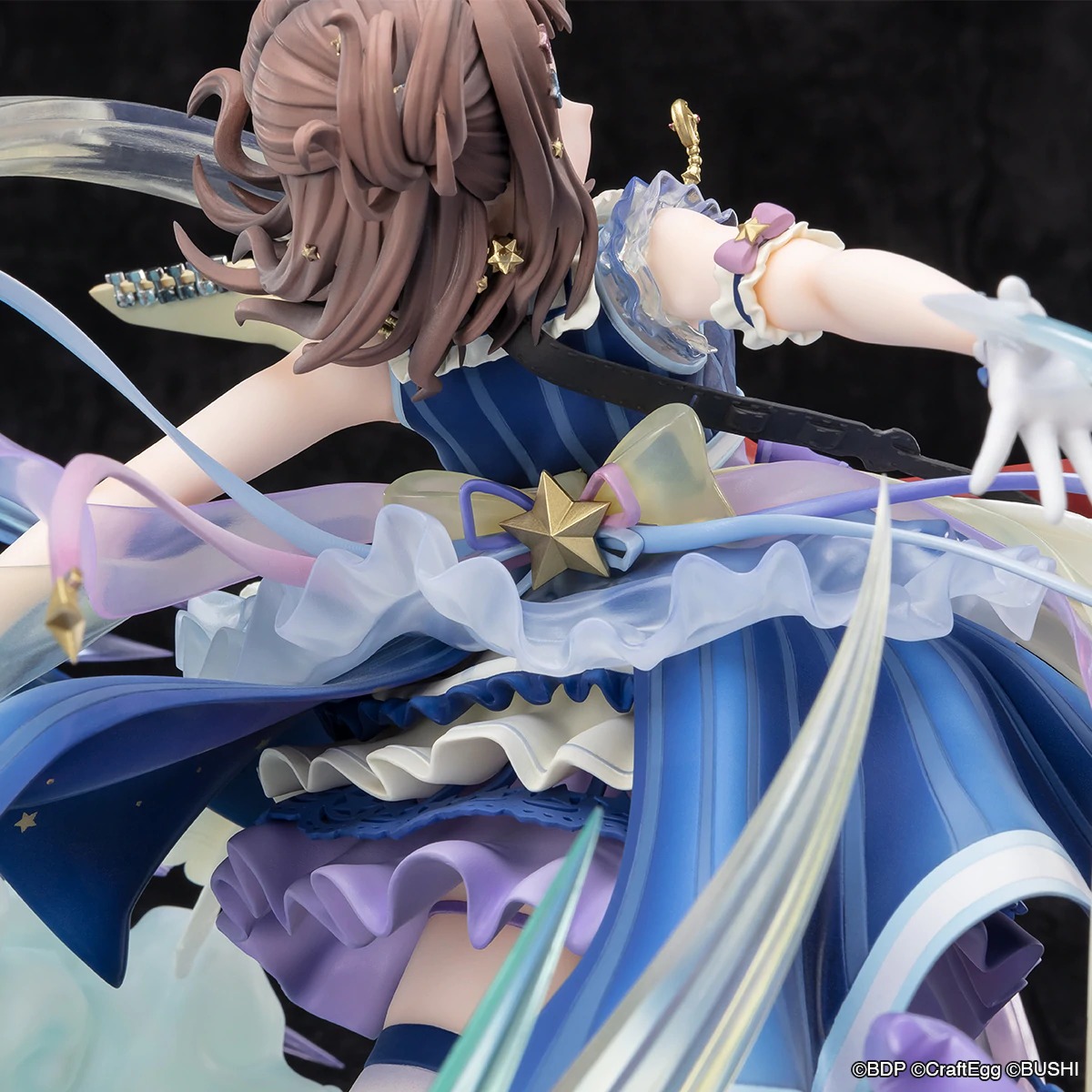 衣装デザインも、リボンやレースなどの細かい装飾や、スカート裏面のデザインまで丁寧に再現しております。香澄のツインテールのハネ具合などもこだわって制作いたしました。