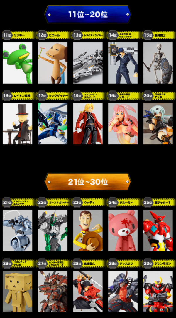 【リボルテック】10周年記念「オールアイテム人気投票」結果発表 2016年06月30日 20:52 figma・リボルテックリボルテック|CM() 結果発表 ■海洋堂 リボルテック10th Anniversary 人気投票結果発表 1位 レイカル・オリハルコン 2位 トロ 3位 クロ ほか kaiyodo.co.jp/rv10/