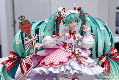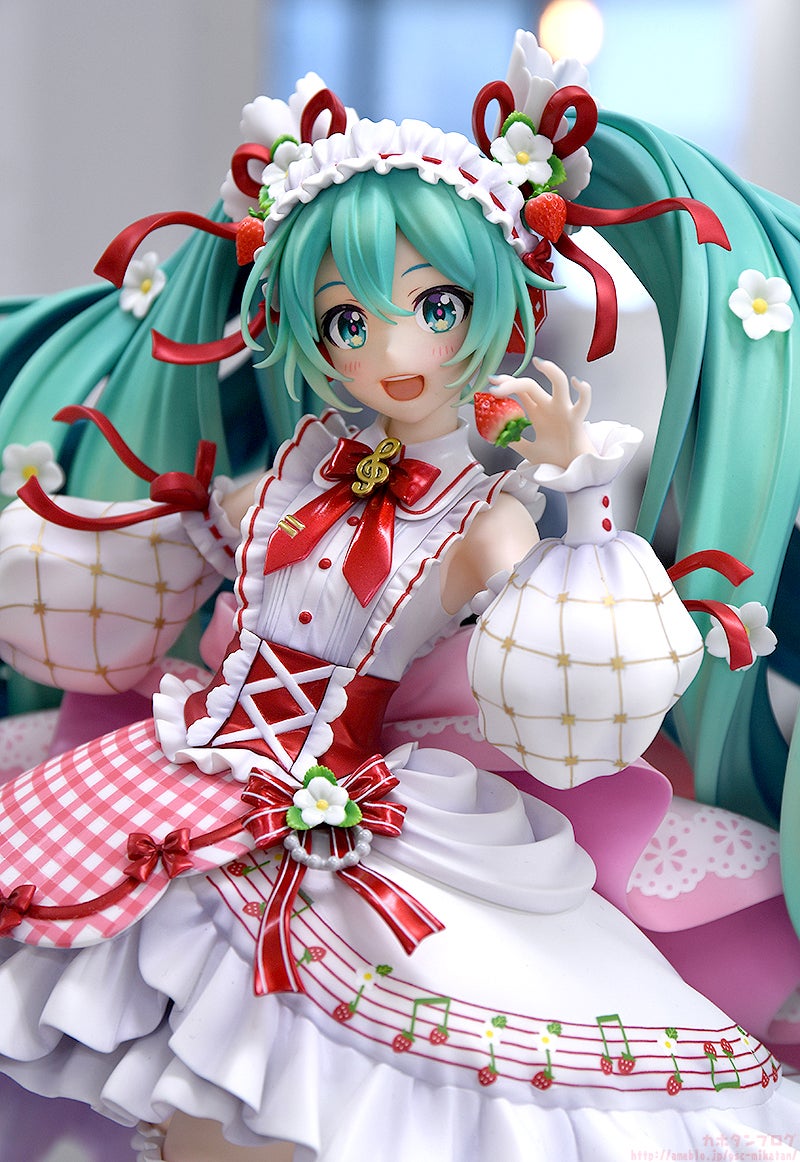 2022年8月31日に15周年を迎える「初音ミク」が、15周年にちなんで可愛い「苺」をモチーフにしたデザインで登場!イラストレーター森倉円氏のフィギュア用の描き下ろしビジュアルをモチーフにスケールフィギュア化いたしました。苺やフリルに彩られた豪華な衣装や、本物を思わせる食器類、螺旋を描くように立体的なツインテールなど、様々な角度からお楽しみいただけます。初音ミク15周年をお祝いする記念フィギュアを是非お迎えください。