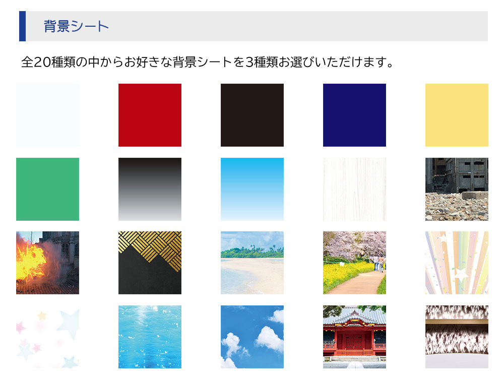 ※背景シートは20種類の中から3枚をお選びいただけます。
