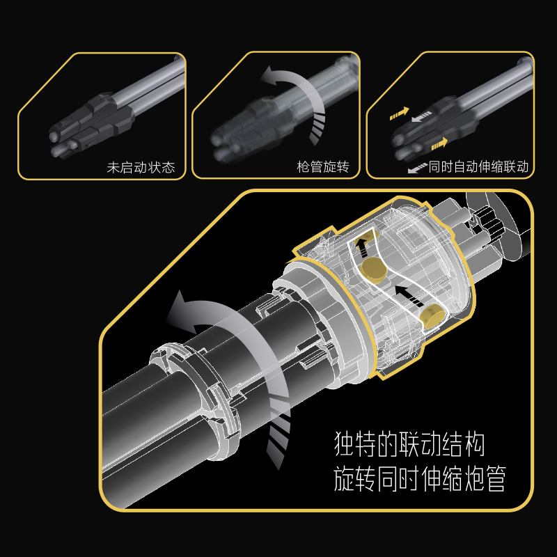 ボタン電池の動力で砲身の回転と伸縮動作を同時に実現するという独創的なギミックを搭載!