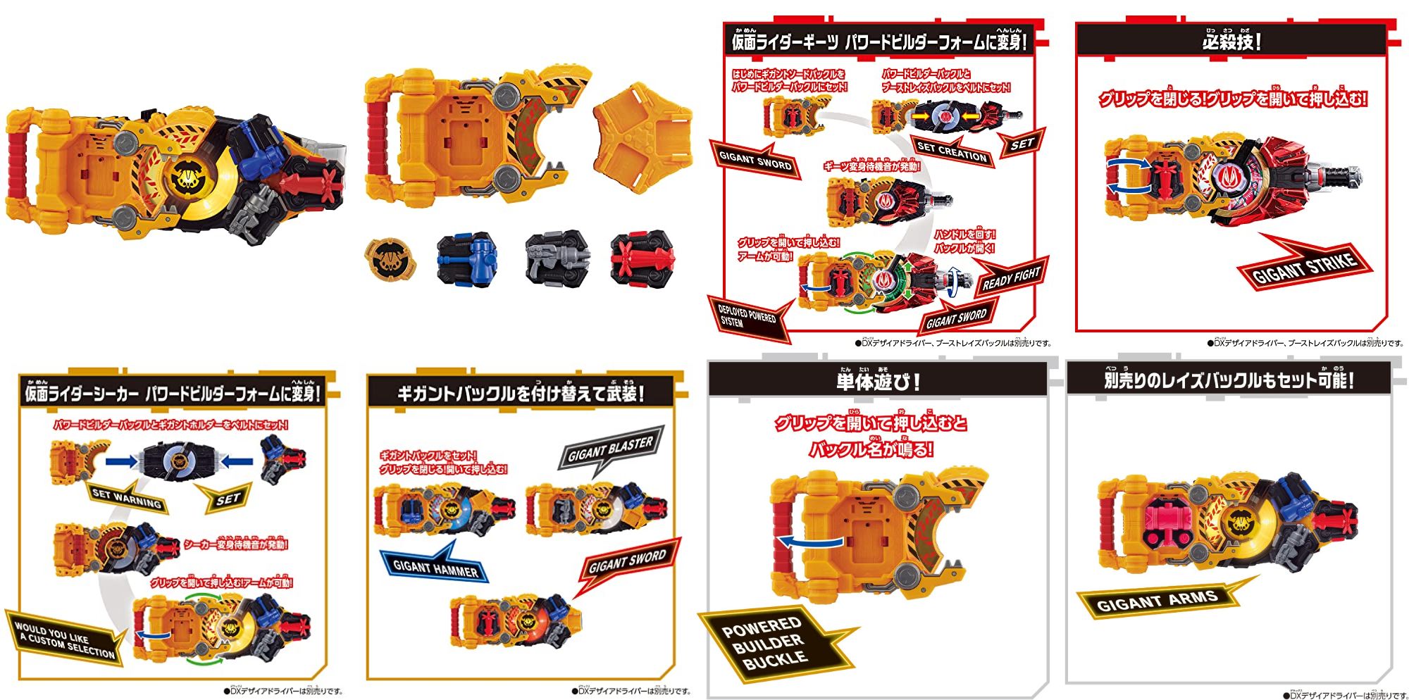また、仮面ライダーシーカーコアIDとパワードビルダーバックル、ギガントホルダーをベルトにセットすると、仮面ライダーシーカー パワードビルダーフォームへの変身なりきり遊びも楽しめます。パワードビルダーバックルにギガントバックルをセットすると武装遊びができます。さらに、ギガントハンマー・ギガントブラスター・ギガントソード3つのバックルを1つずつ付け替えていき、グリップを操作することで超必殺技を発動できます。