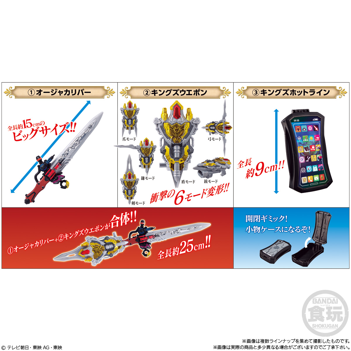 (1)オージャーカリバーや(2)キングズウエポンは玩具同等のギミックが再現でき、武器同士の合体も再現可能!