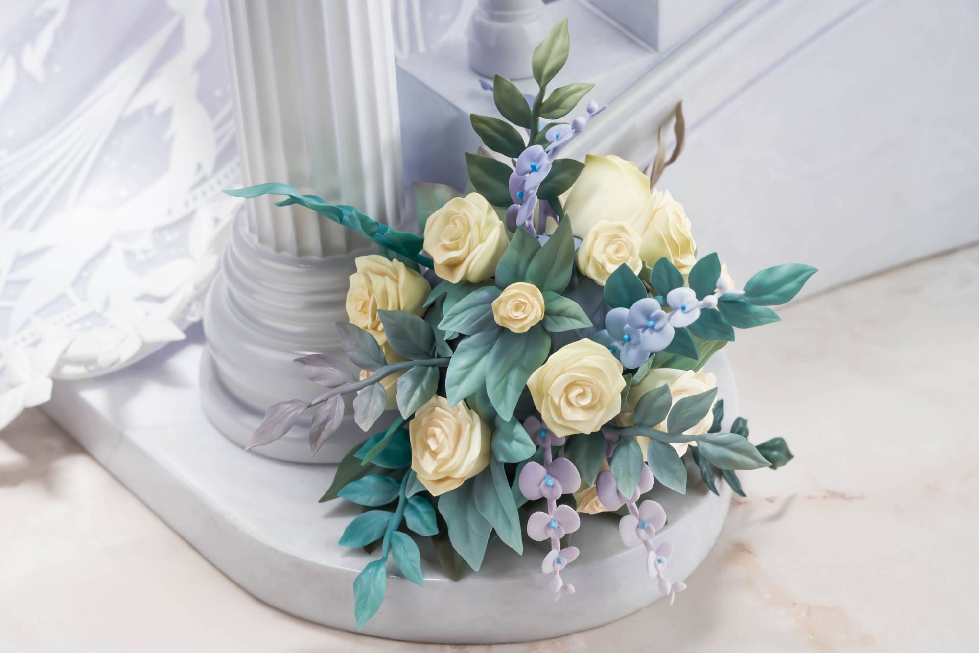 白い花束を手に持ち、階段で立ち止まり、いわゆる見返り美人の構図で立体化。ウェディングドレスは大理石調の階段を覆い尽くすほどの規格外なボリューム。着脱も可能なヴェールとロングスカートはクリアパーツを使用し、さらにグラデーション表現とパール塗装も施すことで上品な質感に仕上げています。