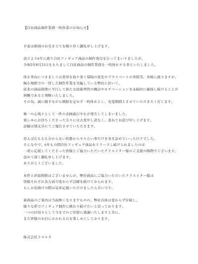 TOP > News > フィギュアメーカー「リコルヌ」、「企画進行中止」と「自社商品制作業務一時休業」を発表