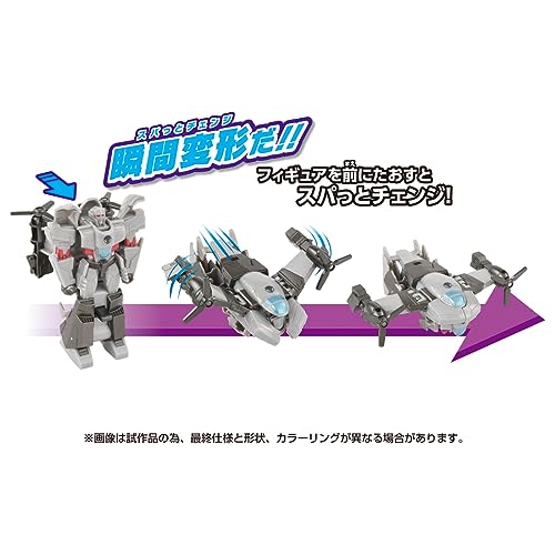 トランスフォーマー アーススパークで活躍するメガトロンがスパっとチェンジで登場。劇中で一瞬でビークルモードに変形して出撃する変形ギミックを表現。ロボットモードのメガトロンを前に倒すだけでビークルモードへ瞬間変形が出来ます。さらに、ビークルモードからロボットモードへもワンアクションで変形でき、誰でも簡単に繰り返し何度も遊べるトランスフォーマー商品です。