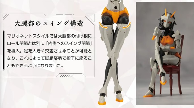 股関節は左右が独立しており、前側に大きく可動する構造を採用していますので「柔軟運動」のようなポーズが実現、脚部は左右へ大きく開くことが可能。「ハイキック」から「コンパクトな座り姿」まで幅広い演技をさせることができます。