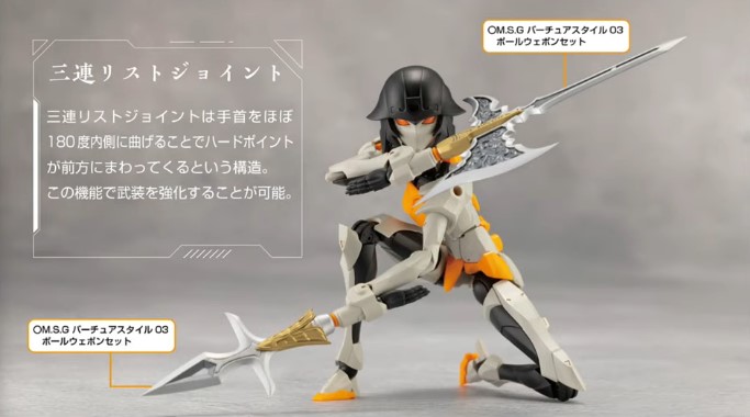 手首をほぼ180度内側に曲げることでハードポイントが前方に回ってくるという構造を採用。別売りのウェポンユニットなどと組み合わせることで腕そのものが武器となった怪人的なキャラクターを作ることもできます。「通常リストジョイント」と「スペーサー」を使うことでお好みのスタイルで楽しむことができます。