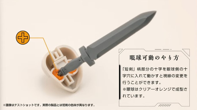 プリンシパルのマスクパーツは2種類が付属。通常タイプの他に試験的に導入した「眼球可動タイプ」をご用意しました。眼球可動タイプの眼球は付属する短剣の柄部分を使って目線を上下左右など自由に動かすことができます。