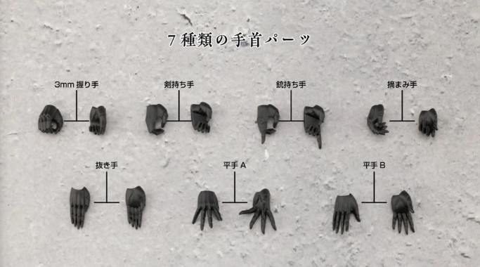 手首の表情は全部で7種類。主に「剣を持つ」ことを想定したタイプや「銃を持つ」ことを想定したタイプの他にも手刀や複数の平手があります。