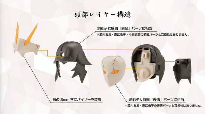 頭部はレイヤー構造になっており、それぞれ取り外しが可能です。バイザー部分は創彩少女庭園の前髪パーツと同じ構造になっているため互換性を持っています。