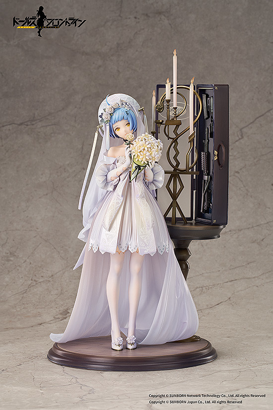 人気スマホゲーム『ドールズフロントライン』より、冷静で有能な少女人形「Zas M21」が、純潔を表すウェディングドレス「花の裏のクオリア」というスキンで1/7スケールフィギュアになって登場です。美人が静かに佇み、純白なウエディングドレスがブーケの後ろの少女の涼しげ顔を際立たせ、可憐な美しさが漂ってきました。銃ケースの中の真っ黒な銃が冷たい光を放ち、影のまだらに落ちた花冠、サリーやティアラが繊細な光沢感と模様の見えるチュールドレスやベール、火の灯った金属の燭台など、ディテールが幾重にも重なり合い、優しくてたおやかな雰囲気を再現しています。二輪草の花に隠れた気持ちは、指揮官の心にも届くのでしょうか。 どうかお手元にお迎え、思う存分お楽しみください!