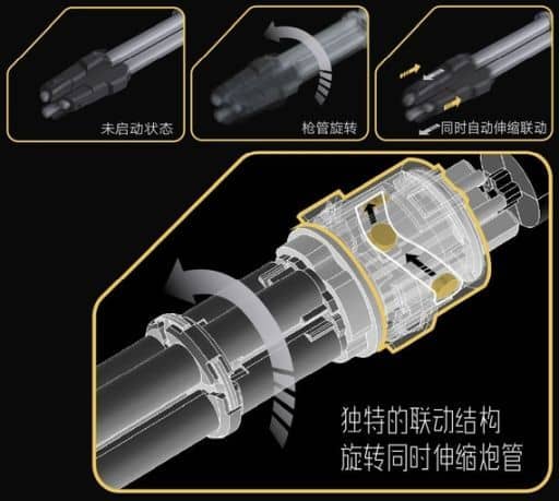 ボタン電池の動力で砲身の回転と伸縮動作を同時に実現するという独創的なギミックを搭載!