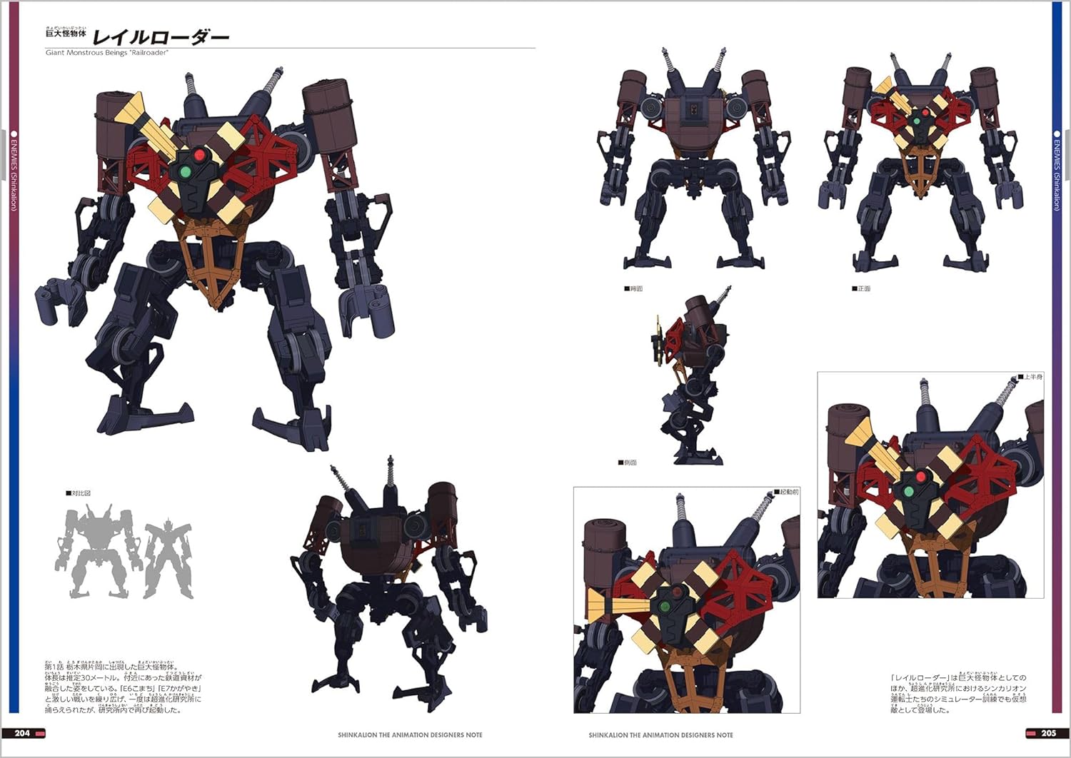 シンカリオンはそれぞれがメインに用いた武装の紹介や3面図なども充実。また、シンカリオンの車両形態やザイライナー、多彩なデザインで物語を彩った敵・巨大怪物体についても同様のポリシーで大きく扱い、ほかに例を見ない究極の設定資料集となっている。