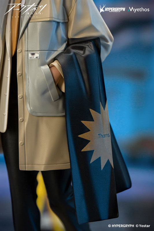 FLOATING GEARシリーズのロドス・アイランド特製コートを羽織り、名前が書かれたマフラーを左腕に掛けた自然な姿は、まるでソーンズがいる日常のワンシーンを切り取ったかのようです。