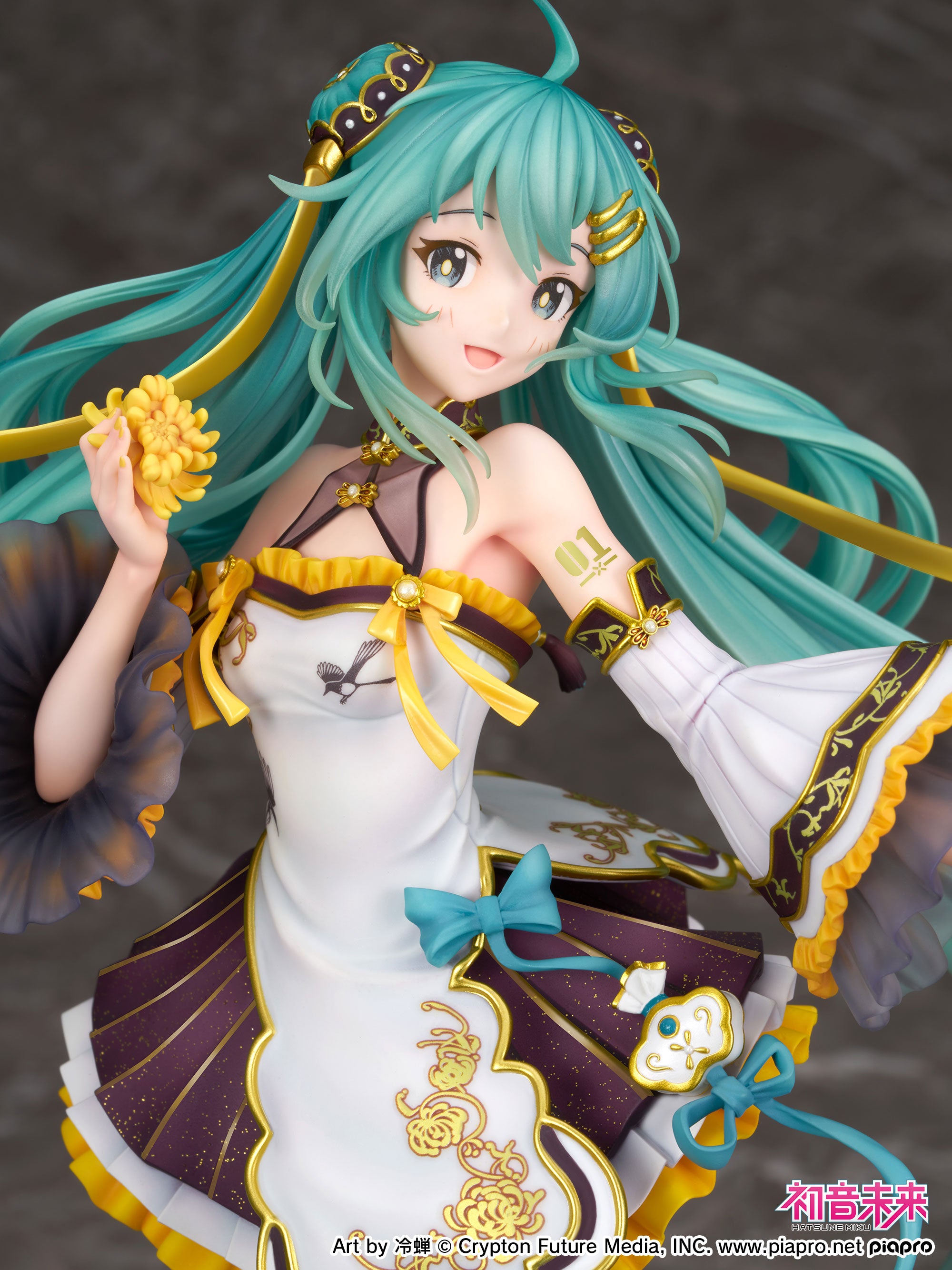 柔らかくなびくツインテールの毛先にはクリアパーツを使用し、透明感を演出。美しい菊の花弁やしなやかな指先など、隅々に至るまで丁寧に作り込まれ、イラストの世界観を綿密に表現しています。衣装にもこだわりポイントが盛りだくさん♪