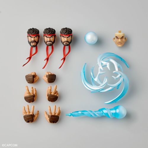 ●リュウを象徴する必殺技、波動拳を大型のエフェクトパーツとして立体化。手元に溜める気の球と、飛ばした気弾、そして周囲へ広がる衝撃波のパーツを組み合わせることで、波動拳と至近距離での波掌撃を表現することができます。