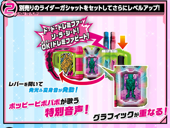 「DXライダーガシャット」シリーズの「DXドレミファビートガシャット」のポッピーピポパポverです。