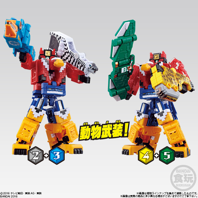 武装状態へ変形し、武装状態は別売りのミニプラ動物合体シリーズのロボに持たせることが可能です。