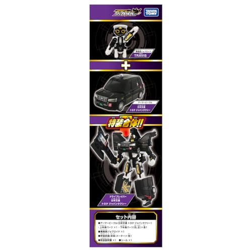 【セット内容】アーマービークル(日本交通 トヨタ ジャパンタクシー)上半身パーツ(1),アーマービークル(日本交通 トヨタ ジャパンタクシー)下半身パーツ(右)(1),アーマービークル(日本交通 トヨタ ジャパンタクシー)下半身パーツ(左)(1),乗務員ジョブロイド(1),斧型武器(本体)(1),斧型武器(メーター)(1),シール(1),取扱説明書(1),