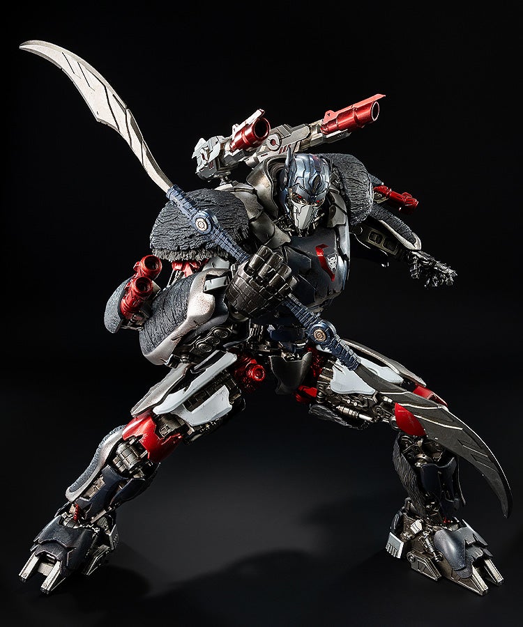 「DLX オプティマスプライマル(ビーストウォーズユニバースエディション)」はダイキャスト製金属を用いたフレームにより、全身の可動ポイントはシリーズ最多の約74ヶ所を実現。胴体、腕、そして脚にあるアクチュエーターシリンダーは実際に可動します。ウェザリング表現を含む精密な塗装が施されています。肩アーマーの特徴的な毛皮は軟質PVCで再現。頭部のマスクパーツは交換式のものが全3種類付属します(口が閉じたバトルマスク、口が開いたバトルマスク、バトルマスク無しの顔)。目にはLED発光機能を搭載。武器として、特徴的なサイバーブレードが2本付属。サイバーブレードはコネクターを介して1本に合体できる他、付属の金属チェーンを介しての接続も可能。交換式の手首パーツが全4対とDLXアクションスタンドが1個付属し、劇中の様々なシーンが再現できます。