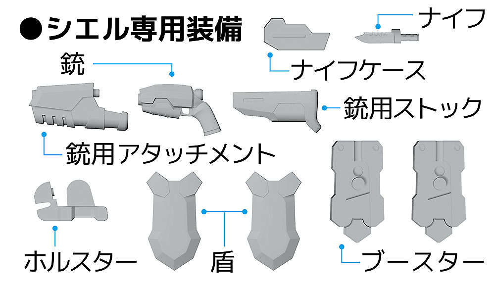 〇武器パーツ付属:「シエル」銃、ホルスター、ナイフ、盾、他