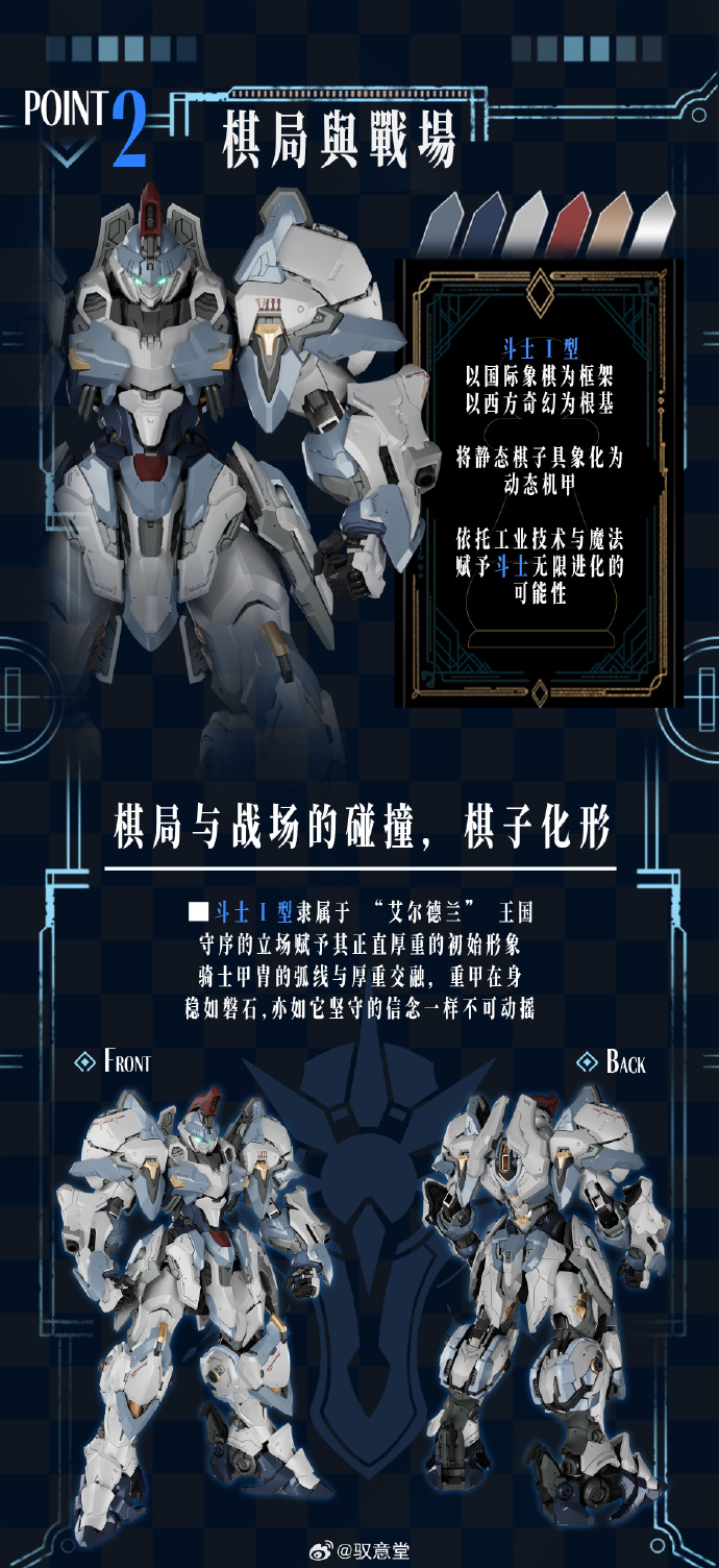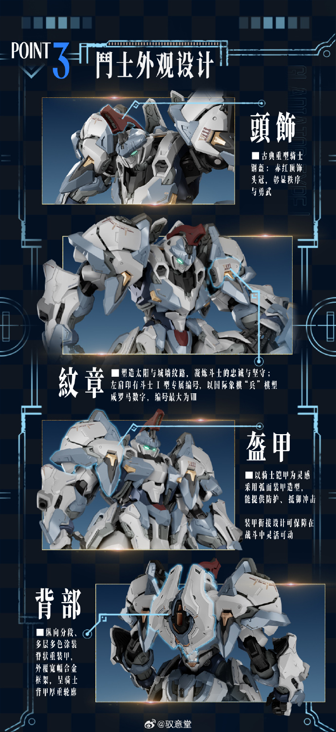 西洋チェスの騎士をモチーフとした装甲と、随所に刻まれた専用エンブレムが重厚で威厳あるシルエットを形成。存在感あふれるスタイルが魅力の一体です。