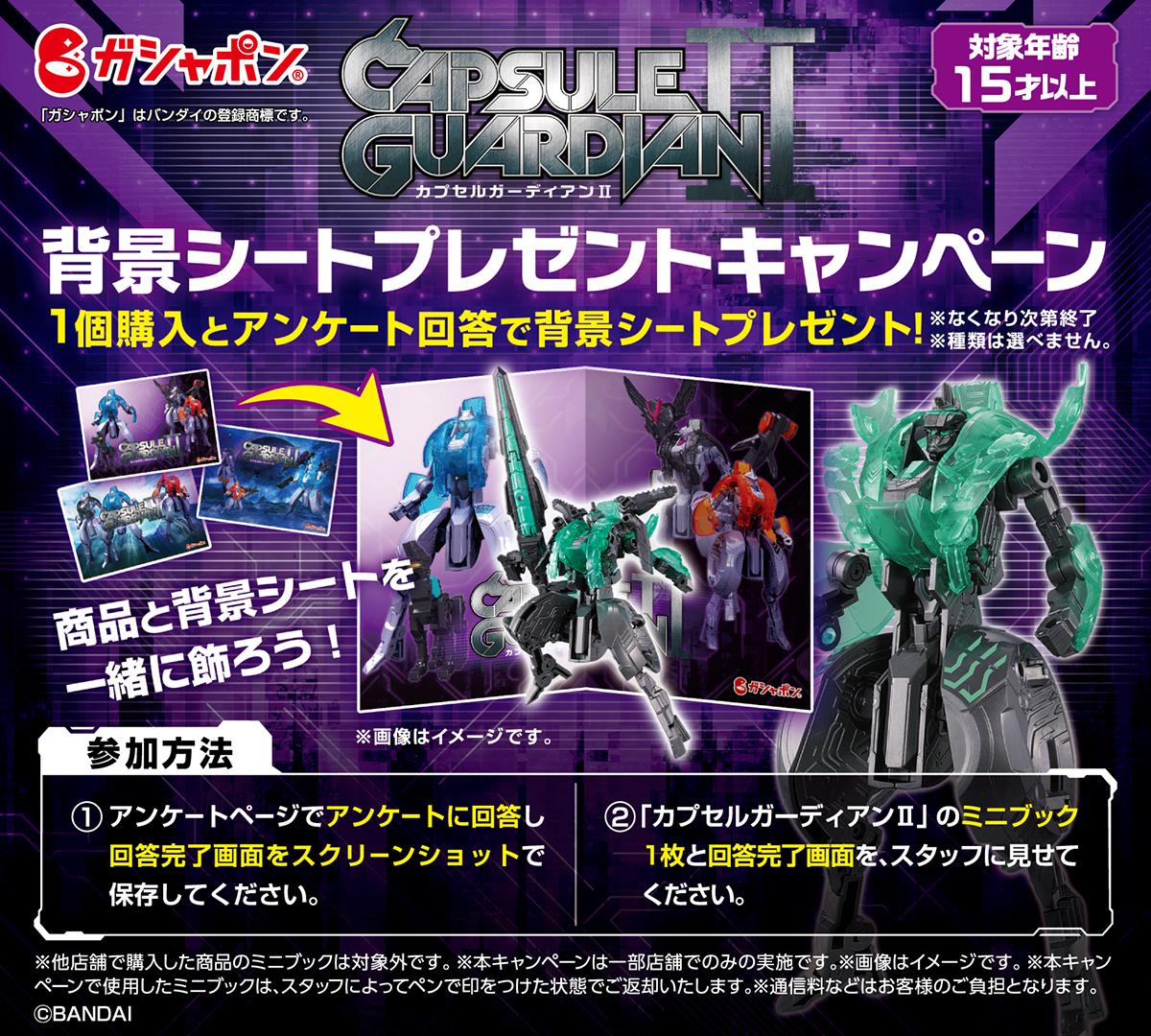 一部店舗限定で「カプセルガーディアンⅡ」1個ご購入と店頭アンケート回答でオリジナル背景シートを1枚プレゼント(全3種)