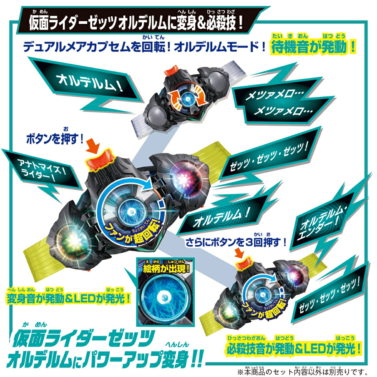 別売りの「変身ベルト DXゼッツドライバー」にセットしボタンを押すことで中央が発光&回転!