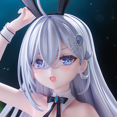 このフィギュアのために描き下ろされたイラストをもとに、バニー耳を気にしてそっとつまみ、ほんのりと頬を染めながらこちらを見つめる青い瞳や