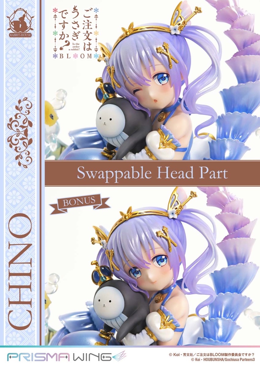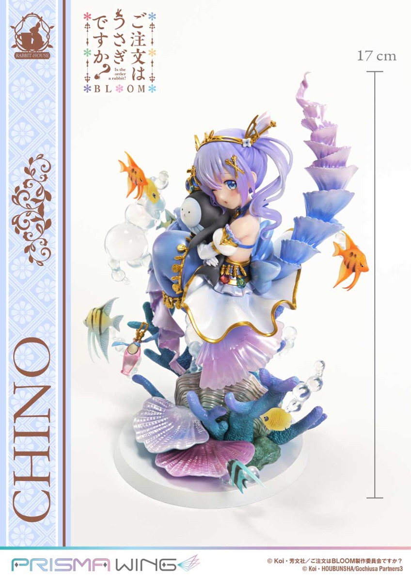 「ご注文はうさぎですか? BLOOM」から、人魚姫をモチーフにしたイラストの「チノ」が初のフィギュア化です。表情やポージングはもちろん、色鮮やかな海の世界も細部まで丁寧に造形しました。いつもはクールな彼女が見せる童話の装い、花盛りのかわいさでお贈りします!