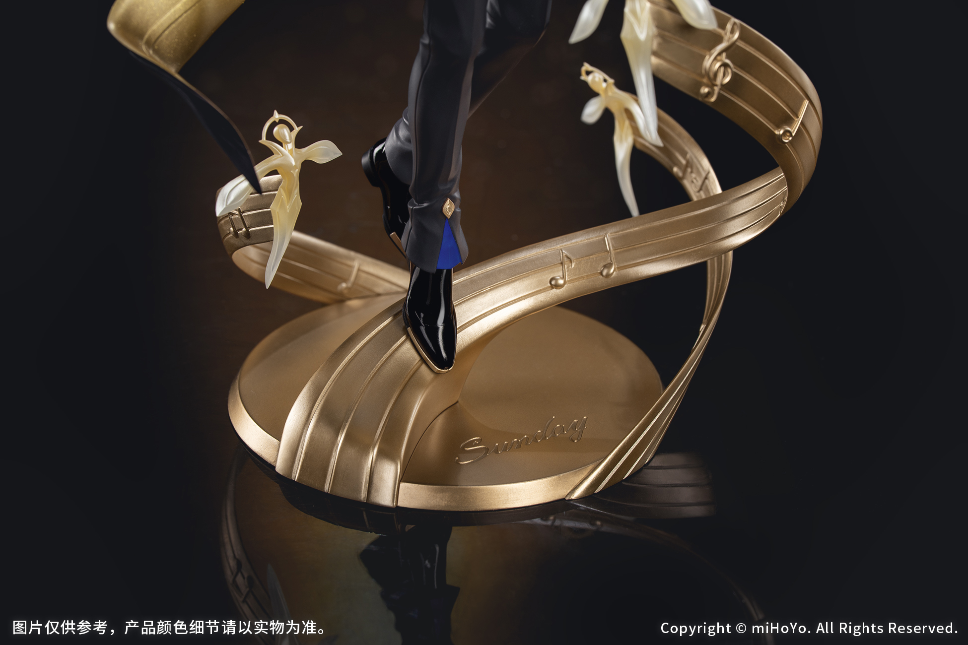 往日の夢のこだまは彼の周囲を漂い、レリーフで表現された楽譜を導いて、メタリック塗装が施された台座へと昇華します。台座には「サンデー」の名が刻まれています。