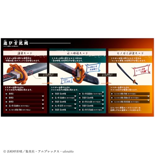 DX日輪刀シリーズより、「DX日輪刀~竈門 炭治郎~」が登場します。全長650㎜のビックサイズで刀身バランスも劇中に近しい比率になり、よりなりきり遊びが楽しみやすい仕様になっております。攻撃音声が楽しめる「通常」モードや炭治郎のセリフ付き呼吸の技が楽しめる「水の呼吸」モードや「ヒノカミ神楽」モードなどを搭載した豪華仕様!
